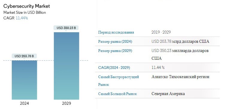 Как оценить объем рынка? Этот вопрос интересен не только гигантам бизнеса, готовящимся к IPO, но и небольшим компаниям – для планирования своей деятельности. Самый простой способ получить ответ – посмотреть оценку мирового рынка, сделанную авторитетными аналитическими агентствами, а потом взять от нее 2% (долю России в мировой экономике). Например, мировой рынок кибербезопасности в 2024 г. Mordor Intelligence оценивает в $203,78 млрд (рис. 1). Соответственно объем российского рынка составит 406 млрд руб. – цифра, не вызывающая резкого отторжения.