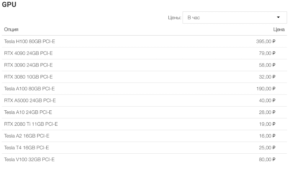 Цены на услуги с GPU строятся по аналогии с классическими сервисами IaaS: базовая тарификация учитывает использование CPU, RAM и дискового пространства, а стоимость использования GPU добавляется отдельно.
