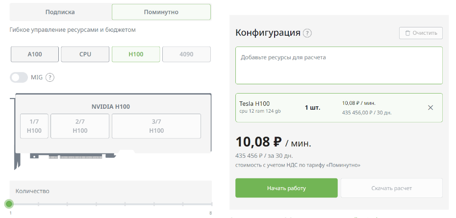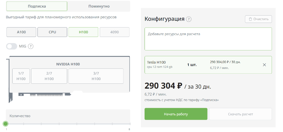 Тарифы варьируются от помесячной до поминутной оплаты. Стоимость аренды сервера с Nvidia Tesla H100 (на данный момент это одна из самых дорогих и мощных GPU на рынке) обойдется в 10,08 руб. за минуту или 290 тыс. руб. за 30 дней.