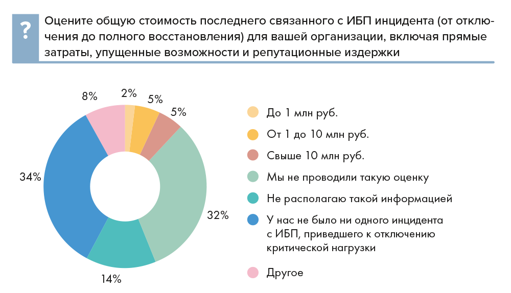 Стоимость той или иной аварии – обычно болезненная тема для респондентов, и на такие вопросы они отвечают крайне неохотно. Тем не менее в ходе опроса, проведенного «Парус электро» и iKS-Consulting, ряд специалистов оценили общую стоимость последнего связанного с ИБП инцидента (от отключения до полного восстановления) для своей организации (рис. 2). Только в трети компаний ответили, что у них не было ни одного инцидента с ИБП, приведшего к отключению критической нагрузки.