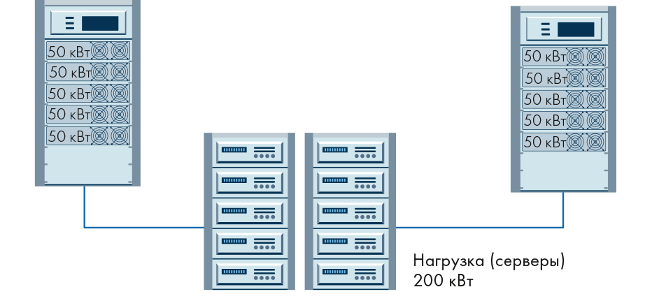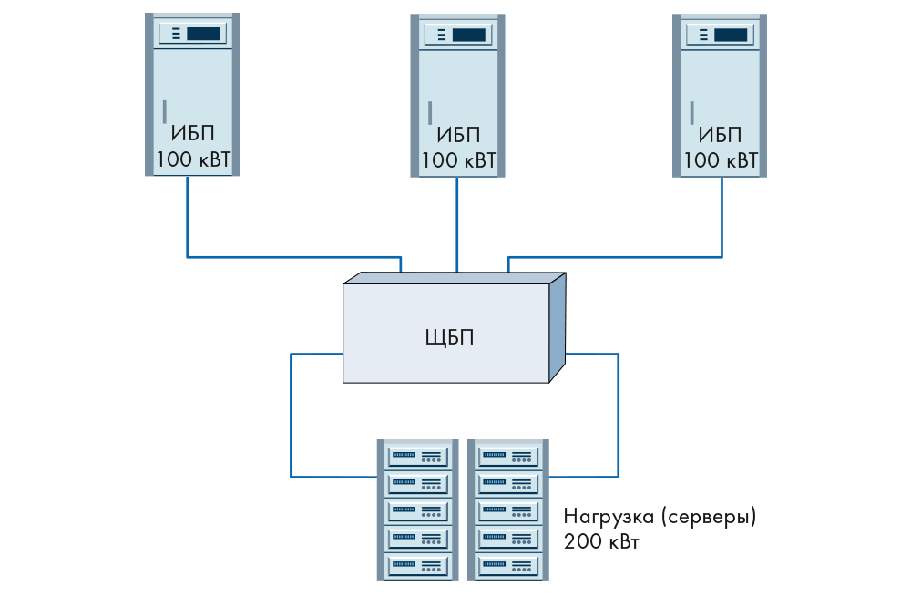В качестве примера рассмотрим ЦОД с ИТ-нагрузкой 200 кВт. Для ее обслуживания можно установить, скажем, два ИБП по 100 кВт (N + 0). Чтобы организовать резервирование по схеме N + 1, необходимо установить в параллель еще один такой ИБП (рис. 4).