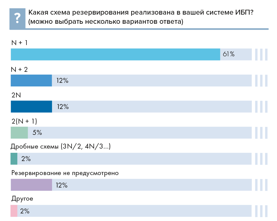 Наиболее известна схема резервирования на уровне компонентов N + 1. Она же, как показало исследование, наиболее популярна в российских ЦОДах – ее используют более 60% респондентов (рис. 3).