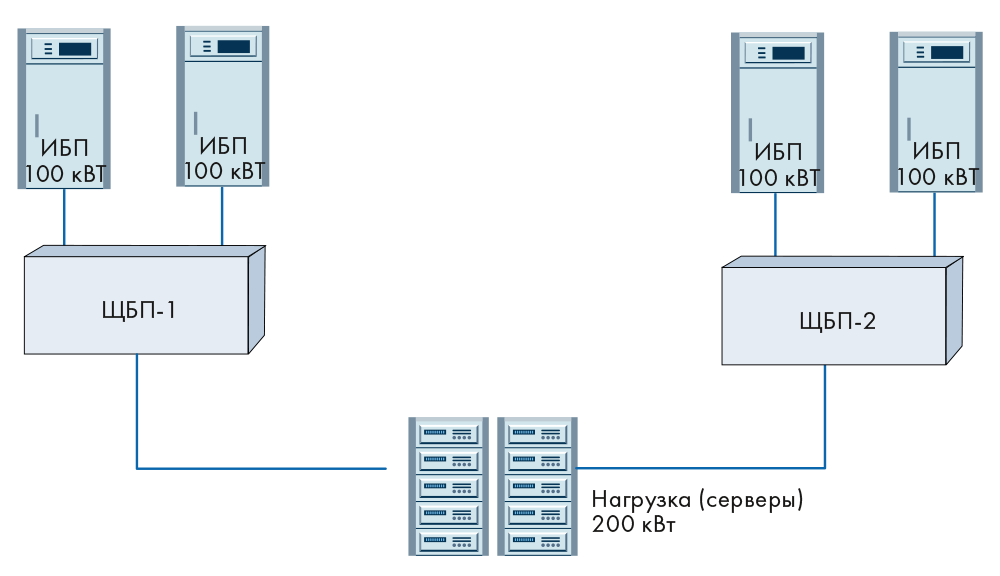 К основным преимуществам схем N + R следует отнести относительную простоту как самой системы, ее масштабирования и эксплуатации, так и управления нагрузкой. Главный недостаток – более низкая надежность по сравнению с системами 2N (которые будут описаны ниже). Так, в системе, показанной на рис. 4, присутствует единая точка отказа в виде распределительного щита бесперебойного питания (ЩБП).
