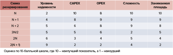 Экспертная оценка основных схем резервирования по рассмотренным критериям приведена в табл. 2. Как уже отмечалось, наивысший уровень надежности обеспечивает схема 2(N + 1), но она же требует наибольших расходов и наибольшей площади. Дробный вариант 3N/2 выглядит сбалансированным по всем основным показателям, но характеризуется наибольшей сложностью.