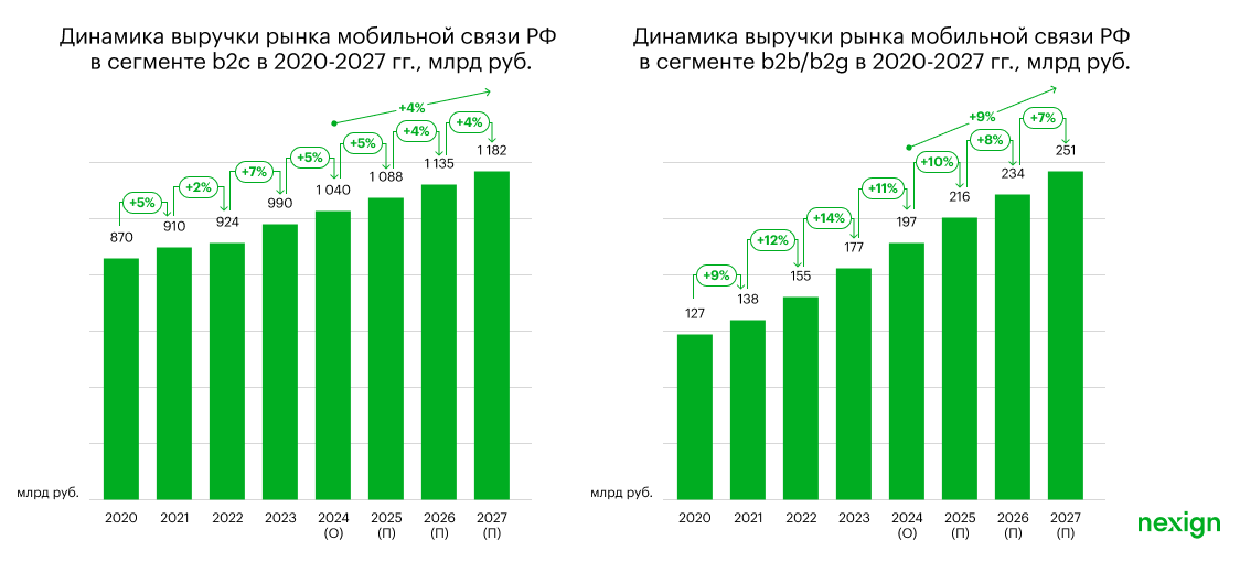 По данным исследования, в 2024 году рынок мобильной связи вырос на 5% и составил 1,24 трл. руб. 85% выручки операторов пришлось на сегмент b2c, 15% — на b2b/b2g. При этом рост b2b-сегмента практически в два раза опережает показатели b2c, и ожидается, что к 2027 году b2b-выручка достигнет 251 млрд руб. при среднегодовом темпе роста в 9%. Сегмент b2c также продолжит рост, но более скромными темпами — на 4% ежегодно.