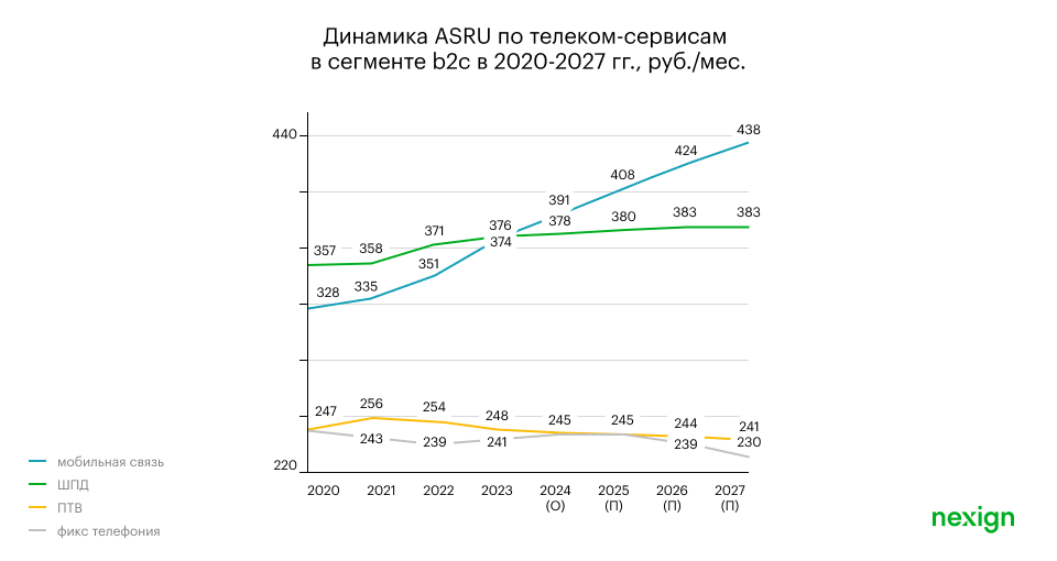 В сегменте b2c показатель ARPU традиционно самый высокий в мобильной связи: он составил 391 руб./мес. в 2024 году с прогнозом роста до 438 руб./мес. к 2027 году. В свою очередь, ARPU для телефонии и платного ТВ упадет с 245 до 230 руб./мес. и с 245 до 241 руб./мес. за тот же период времени, соответственно. Это объясняется снижением интереса к этим услугам и уменьшением абонентской базы. Для широкополосного доступа (ШПД) ARPU вырастет с 378 до 383 руб./мес. в сегменте b2c и с 2,75 до 2,77 тыс. руб./мес. в сегменте b2b/b2g. Здесь тенденция к медленному росту связана с насыщением рынка в крупных и средних городах и сохраняющейся популярностью беспроводного интернета. Значительный рост показателя выручки на одного клиента в отдельных телеком-направлениях не возможен из-за высокого уровня их проникновения и конкуренции в сегментах b2b и b2c. Поэтому операторы продолжают делать ставку на комплексные, конвергентные предложения, которые включают сразу несколько типов связи, дополнительные цифровые продукты и услуги — свои или партнерские.