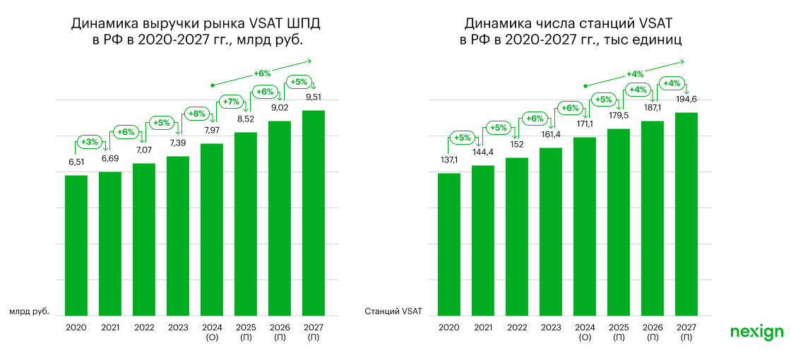 Индустрия фиксированной спутниковой связи (VSAT) демонстрирует стабильный рост: в 2024 году выручка увеличилась на 8% и составила 7,97 млрд руб., а в 2025-2027 годах будет расти в среднем на 6% ежегодно. Также происходит расширение отрасли за счет стабильного увеличения количества базовых станций: в 2024 году насчитывалось около 171 тысячи станций VSAT, а к 2027 году их численность вырастет до 194 тысяч.