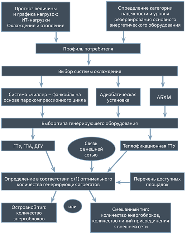 Разработанный авторами алгоритм выбора состава генерирующего оборудования, учитывающий такие факторы, как уровень надежности, связь с внешней сетью, вид охлаждения, требования к резерву мощности, может применяться при проектировании схем энергоснабжения ЦОДа любой мощности.