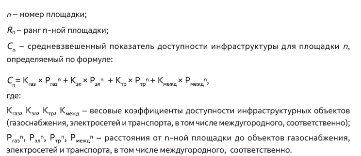 Ранжирование потенциальных площадок проводится по формуле (2) в соответствии с присвоенными весовыми коэффициентами.