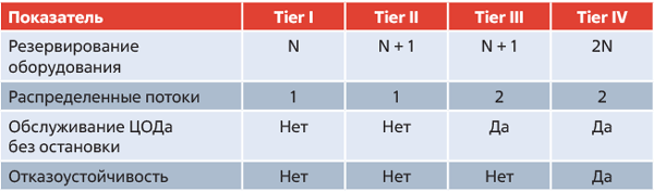 Для классификации и оценки надежности ЦОДов и доступности предоставляемых на их базе сервисов в мире широко используется система стандартов, разработанная Uptime Institute. На основе конкретных требований к архитектуре и инфраструктуре ЦОДа стандарты Tier определяют уровни надежности, оценивая возможности дата-центров с точки зрения времени безотказной работы. Соответственно этому выдвигаются требования к источникам энергоснабжения (табл. 1).