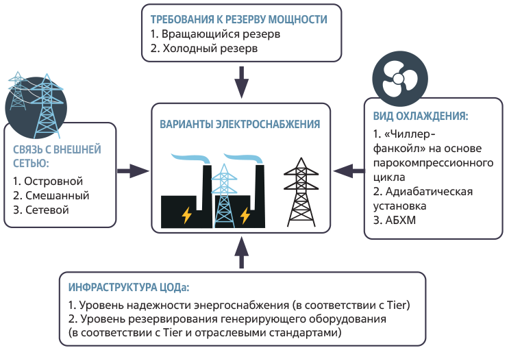 Рис. 2. Факторы, определяющие выбор состава генерирующего оборудования при разработке вариантов энергоснабжения ЦОДа