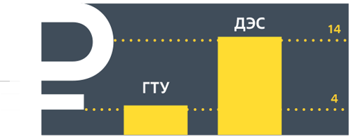 Кроме того, ГТУ имеют более низкую удельную дисконтированную стоимость производства электроэнергии (levelized cost of energy, LCOE), чем, скажем, дизельные электростанции (ДЭС). Например, для крупного потребителя (90 МВт) LCOE составляет 14,52 руб./кВт•ч в случае ДЭС против 4,18 руб./кВт•ч при использовании газотурбинных установок (рис. 1).