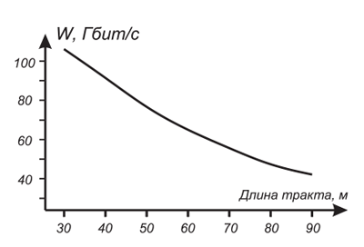 Рис. 1. Расчетные значения максимальной скорости передачи данных, обеспечиваемые медножильными кабельными трактами СКС с двухконнекторными схемами построения