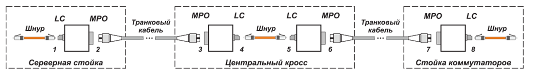 Потери, вносимые в тракт передачи разъемными соединителями, стандартами СКС нормируются величиной 0,75 дБ на один такой компонент. В СКС для ЦОДов допустимо применение только двухконнекторных трактов. При реализации информационной инфраструктуры по популярной схеме spine-leaf в состав тракта обязательно вводится центральный кросс. В такой конфигурации при использовании модульно-кассетной схемы построения стационарных линий количество соединителей увеличивается до восьми (рис. 5). Четыре таких разъема (с нечетными номерами) являются рабочими, а четыре (с четными номерами) выполняют функции технологических.