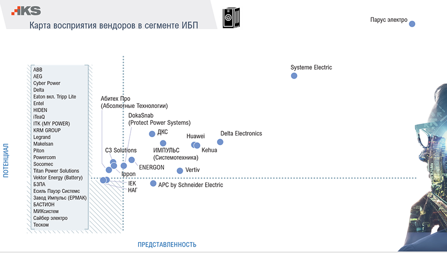 Лидер топ-10 компания «Парус электро» значительно опередила коллег-конкурентов в своем сегменте (ИБП). За исключением этого отрыва позиции остальных участников рейтинга изменились ненамного. Азиатские производители (Delta Electronics, Kehua и Huawei) идут плотной группой в середине правого верхнего квадранта, а западные – Schneider и Vertiv – теряют позиции, но пока не опустились в левый нижний квадрант. Стоит отметить прогресс компании «Импульс» («Системотехника»).