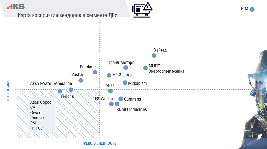 В сегменте ДГУ российским заказчикам по-прежнему доступны западные двигатели, хотя и с некоторыми сложностями. При этом растет использование китайских (Yuchai, Weichai) двигателей. Пакетирование происходит в основном в РФ, поэтому неудивительно, что российские пакетировщики заняли правый верхний угол. Явный лидер – компания ПСМ, которая и в топ-10 находится на высоком седьмом месте. Однако в целом изменений в сравнении с прошлым годом не слишком много.