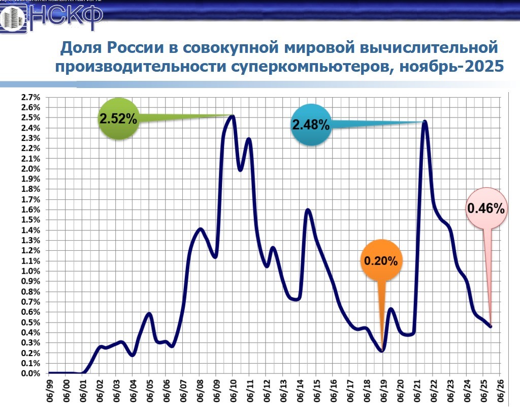 На Национальном суперкомпьютерном форуме, прошедшем в ноябре 2025 г. в Институте программных систем имени А.К. Айламазяна РАН (Переславль-Залесский) и Российской академии народного хозяйства и государственной службы при Президенте РФ, председатель оргкомитета НСКФ член-корреспондент РАН Сергей Абрамов отметил, что достижения четверки лидеров — это результат исследовательских проектов, финансируемых государством. Российские же суперкомпьютеры, которых в Top500 стало еще меньше (вслед за MTS GROM рейтинг покинул суперкомпьютер «Ломоносов-2»), принадлежат коммерческим структурам. А по суммарной вычислительной мощности страна продолжает проседать, и теперь ее суммарная доля в Top500 составляет всего 0,46%.