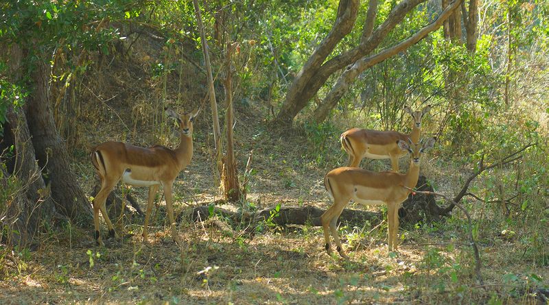 Настороженно смотрят на подъехавшую машину стройные антилопы импала. Свой гарем охраняет самец — показывает рога, прижимает уши и поднимает хвост. Если появится конкурент — начнет толкаться с ним рогами. Если проиграет поединок — придется отдать самок победителю.