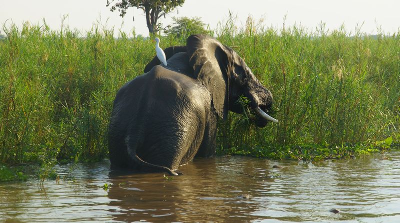 Мы в нацпарке Ливонде, точнее, на левом берегу реки Шире. Багрянец заливает небо, поют птицы, возвращаются в воду пасшиеся ночью на траве бегемоты, тянутся на пастбище спавшие в кустах большие антилопы — водяные козлы.