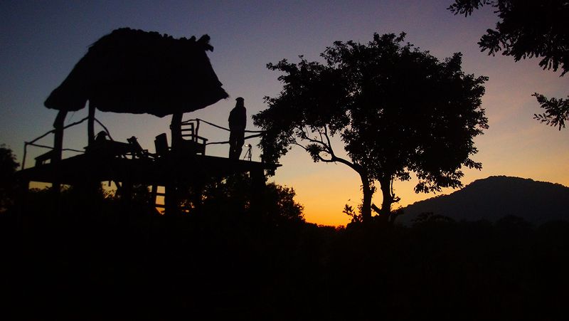 С вечера были слышны выстрелы — рейнджеры отгоняли от деревни слонов. Спал плохо, к походному режиму еще не адаптировался. Под утро встали, разбудили спящую в кустах антилопу, обогнули баобаб, прошли по еще сонному тропическому лесу и поднялись на деревянную платформу — встречать рассвет.