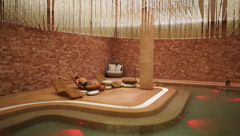 Изюминка — огромный подземный оздоровительный комплекс, включающий финскую сауну, соляную комнату, травяные, ароматизированные и этнические спа и джакузи. Посетители могут заказать укрепляющие здоровье пантовые ванны — с экстрактом из рогов марала, омолаживающие процедуры и спа-программы. Помимо обычного двадцатипятиметрового бассейна для спорта есть поменьше с морской водой. В круглосуточно работающей «качалке» можно не только поднимать тяжести, но и пробежаться по набережным разных городов мира — симулятор выводит картинку выбранного для тренировки места на монитор. И мало какой из пятизвездочных отелей может похвастаться поднимающимся от входа на горнолыжные склоны кабинками фуникулера.