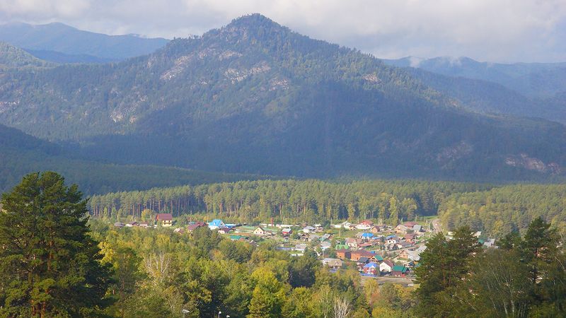 Внизу поселок Манжерок, ставший знаменитым в 70-е после появления одноименной песни. Песня возникла не случайно — в 1966 году Советский Союз подписал соглашение о сотрудничестве с Монголией, и в честь этого события на Алтае у озера и села Манжерок устроили большой молодежный фестиваль, посвященный дружбе советских и монгольских граждан. А песню заказали как гимн фестиваля.
