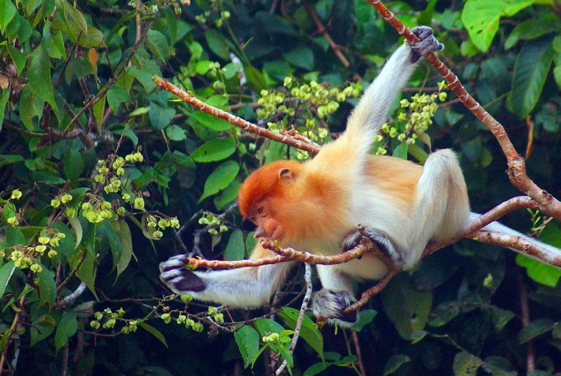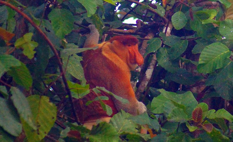 Проплыв около получаса по реке Кинабатанган, увидели на деревьях местных эндемиков —носачей, обезьян со смешным, похожим на огурец носом. У самок нос более аккуратный — но тоже забавный, острый, как у Буратино. Носачи — отличные ныряльщики и пловцы, одни из немногих обезьян, способных преодолевать большие расстояния на двух ногах.