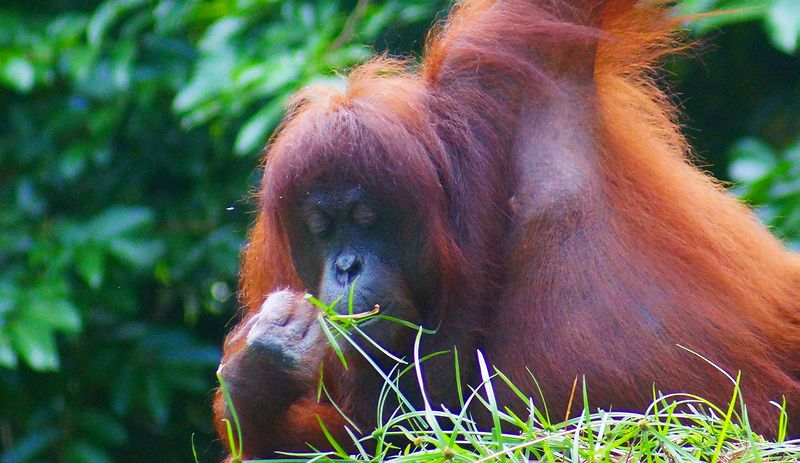 Самец действительно выглядел грозно, ниже меня ростом, но гораздо шире в плечах. Нападет — не справишься. Находившийся недалеко вооруженный бамбуковой дубинкой местный предупредил, что если орангутан начнет двигаться к нам — надо сразу убегать. А вот самки меньше и выглядели довольно безобидно. Пока пытался сфотографировать — подкрался детеныш и попробовал помочиться сверху мне на голову. Не попал.