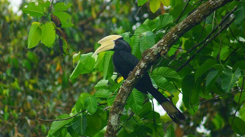 Зато увидели описанную в книге птицу-носорога, символа штата Саравак, попавшую и на герб Малайзии. У птицы интересный подход к размножению. Самец ищет для семьи «квартиру» — подходящее дупло, после чего приглашает посмотреть «дом» самку. Если её жилплощадь устраивает — самка соглашается на спаривание. После откладывания яиц самец замуровывает дупло глиной, оставляя лишь щель для клюва «заключенной». Самка в безопасности насиживает яйца, а самец обеспечивает пропитание, кормя самку через щель. Через эту же щель самка испражняется. Вырубка лесов сильно ударила по численности птиц — нет жилплощади — нет спаривания — нет потомства. Так что встреча с этой птицей — большая удача.