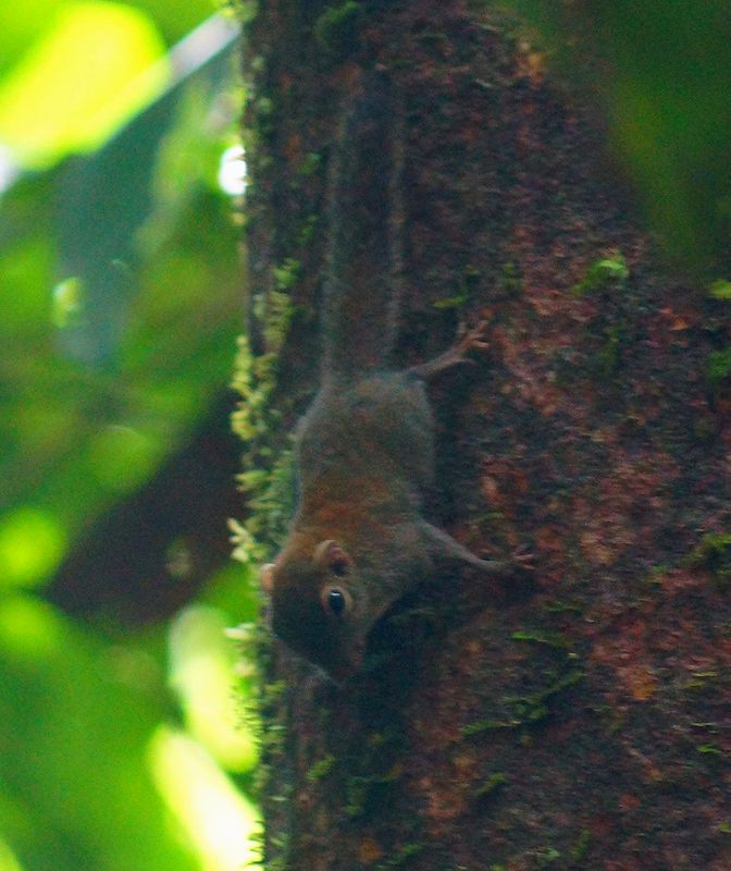 А вот на дереве появляется крошечная, размером с мышь, белка. Это белка Уайтхеда — самый миниатюрный представитель семейства беличьих. Длина тела — сантиметров пять. Белка-дюймовочка не спускается на землю, всю жизнь проводя на деревьях. Она слишком мала, чтобы справиться с орехами — основной рацион малышки мхи и лишайники.