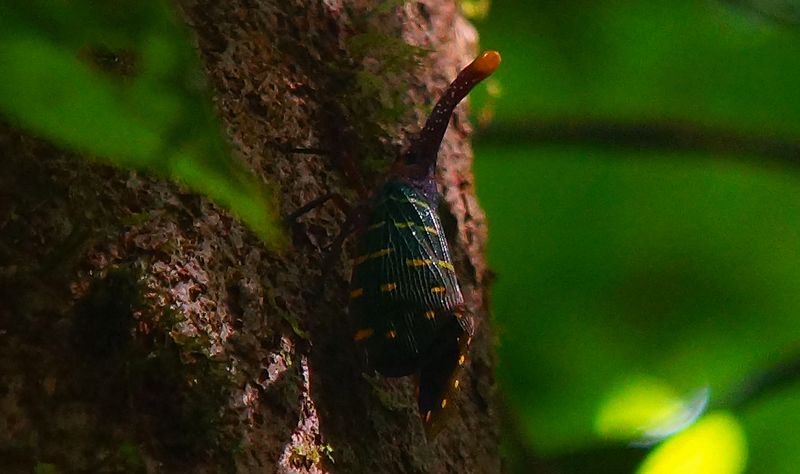 Вот азиатская фонарницаLantern Bug. Название «фонарница» основано на ошибочном предположении, что концевая часть отростка светится ночью, как фонарь. Фотографировать легко — насекомое никуда не убегает, так как занято бурильными работами по добыванию сока из дерева. Чтобы не стать обедом дает взятку — выделяет сладкую массу, которую охотно слизывают с его брюха гекконы. Зачем резать корову, которая дает молоко.