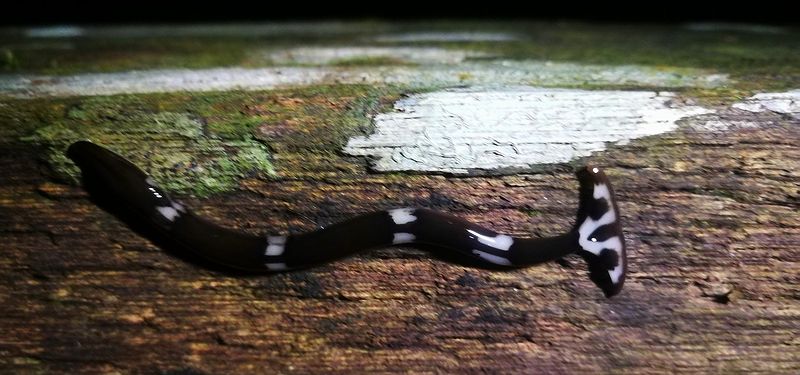 А это плоский молотоголовый червь, а не разрисованная хиппи-пьявка, как мы решили сначала. Хищник. Кровь не пьет, а присоска на голове для атак на улиток и дождевых червей, во время которых выделяет токсин, парализующий добычу. Если нет дождевых червей, может заниматься каннибализмом есть сородичей и даже автоканнибализмом есть себя. Будет потом еда хвост регенерируется.