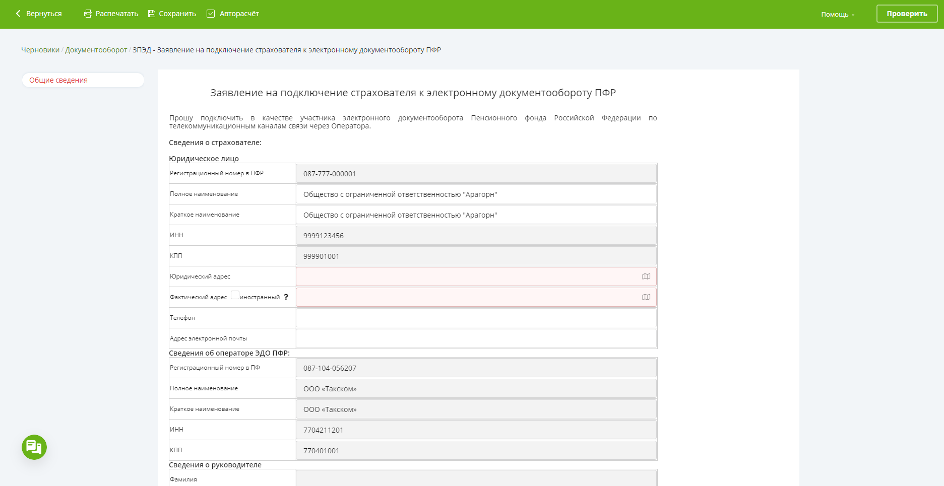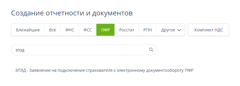 Прежде, чем начать работу с новой формой отчёта, работодатель должен пройти регистрацию в системе электронного документооборота ПФР. Для этого нужно отправить по телекоммуникационным каналам связи «Заявление на подключение страхователя к ЭДО ПФР» (форма ЗПЭД). Для этого на главной странице сервиса «Онлайн-Спринтер» нужно нажать «Создать» в левом верхнем углу, выбрать направление обмена «ПФР», затем ввести в поисковую строку нужную форму.