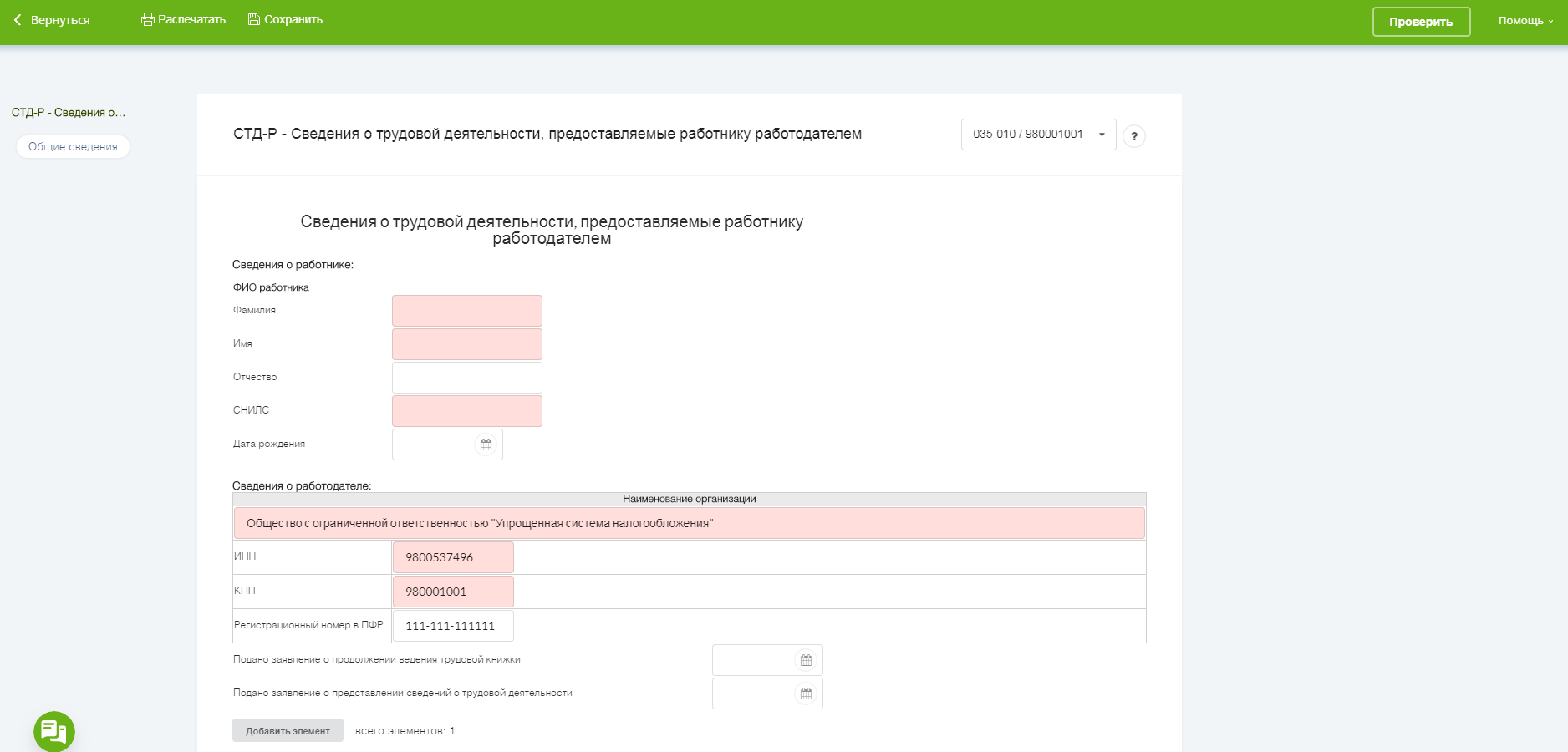 После получения подтверждения о том, что заявление принято, можно начинать работу с формой «Сведения о трудовой деятельности застрахованного лица» (СЗВ-ТД).