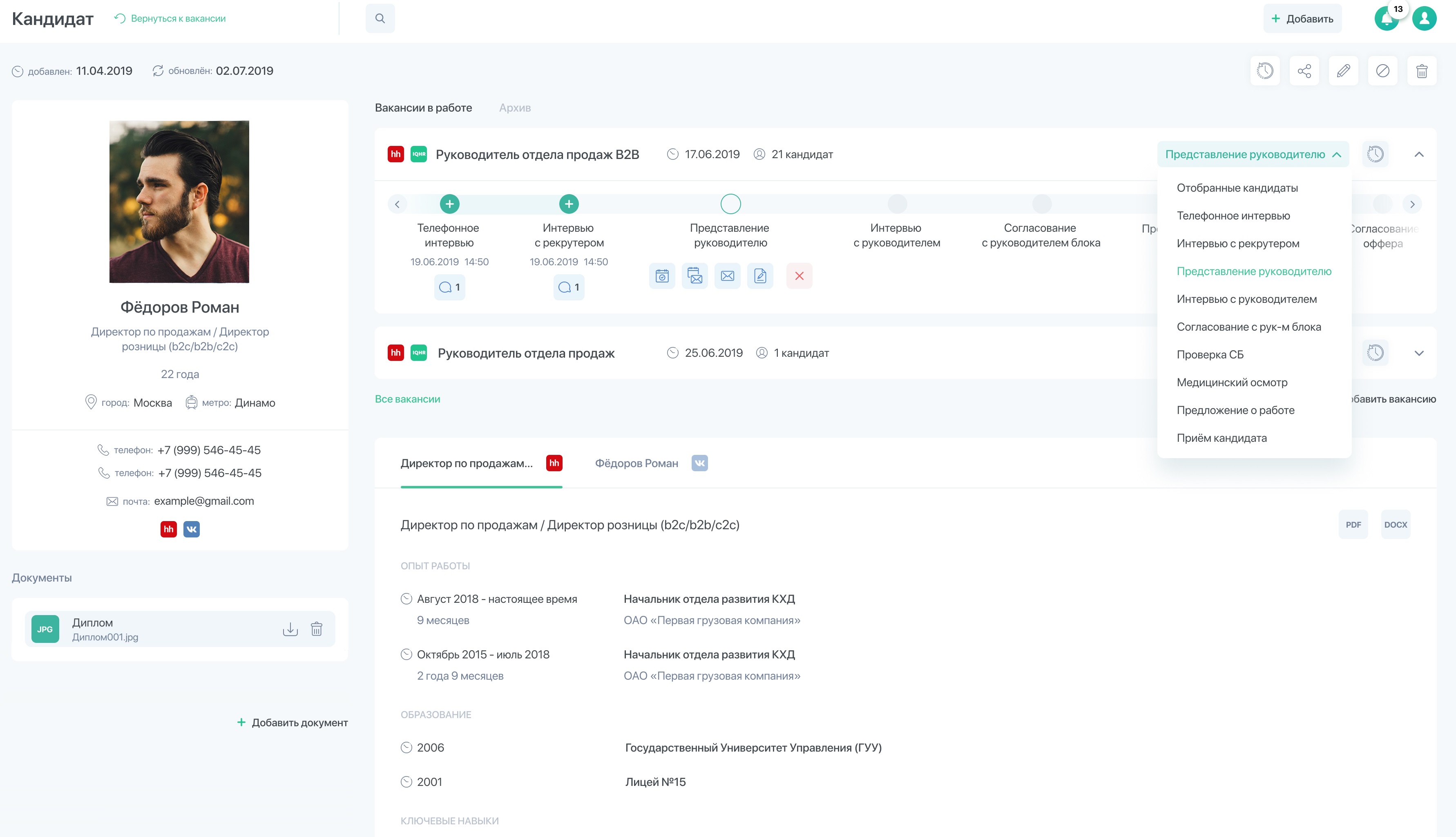 · учет полной истории взаимодействия с кандидатами, включая отзывы специалистов HR-блока;