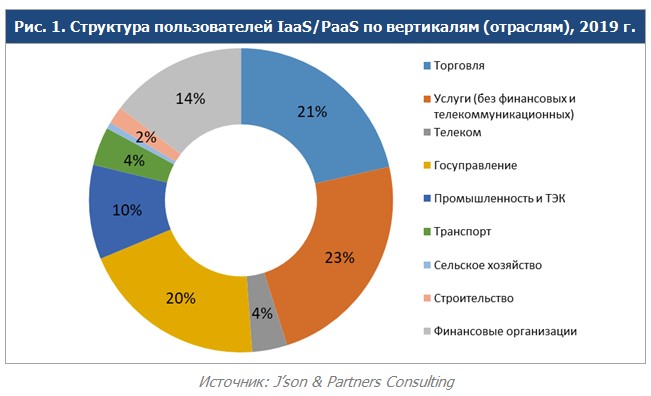 По данным J'son & Partners Consulting, в 2019 году почти 80% компаний-пользователей IaaS/PaaS относились к торговле и сфере услуг, включая телекоммуникационные, ИТ, государственные и финансовые (см. Рис. 1). Структура рынка в денежном выражении близка к показанной на Рис. 1 структуре распределения пользователей IaaS/PaaS по отраслям ввиду отсутствия существенных различий в ARPU пользователей различных отраслей. Эта структура стабильна – за период 2014-2019 гг. не было отмечено существенных изменений, за исключением роста в сегменте «Госуправление», связанного с внедрением онлайн-сервисов госуслуг, ЕМИАС и аналогичных. Важно отметить, что высокая доля потребления IaaS/PaaS со стороны торговли и сферы услуг – это обратная сторона крайне низкого объема потребления со стороны промышленных предприятий.