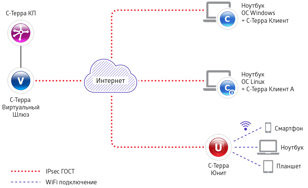 Решение С-Терра можно применять как в малых сетях, до 10 удаленных рабочих мест, так и в сетях большого масштаба, с тысячами сотрудников, работающих дистанционно. В центральном офисе в виртуальной машине, созданной в гипервизоре, устанавливается С-Терра Виртуальный Шлюз, который агрегирует на себе клиентские подключения, а также система централизованного управления С Терра КП. На рабочие места удаленных пользователей устанавливаются дистрибутивы С-Терра Клиент (для всех актуальных версий ОС Windows), либо С Терра Клиент А (для ОС Astra-Linux SE), либо С-Терра Юнит (для любых ОС). Программные клиенты могут использовать любой подходящий вариант подключения (Ethernet, Wi-fi, 4G-модем). С-Терра Юнит поддерживает как проводные, так и беспроводные (WiFi, 3G/4G) каналы связи.