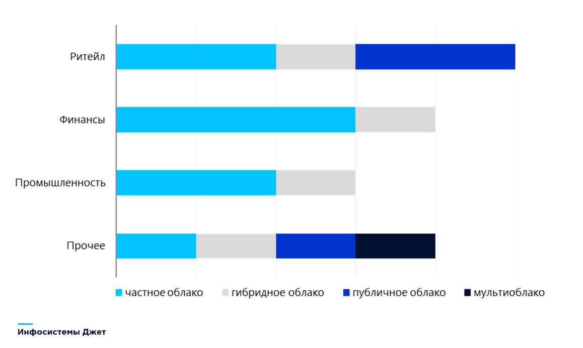 Финансовый и промышленный секторы нацелены в основном на использование частных облаков. Для них характерен акцент на безопасность и высокую производительность. Гибридная модель для предприятий финансов не превышает 25%, а у промышленности — чуть более 30%. Однако по мнению аналитиков, в будущем доля гибридной модели в этих секторах вырастет, так как позволяет быстро стартовать новые ИТ-инициативы. Например, проекты, включающие разработку, Proof of Concept, тестирование новых технологий или решений, могут быть легко запущены на арендованных ресурсах, а в случае неудачи так же быстро свёрнуты.