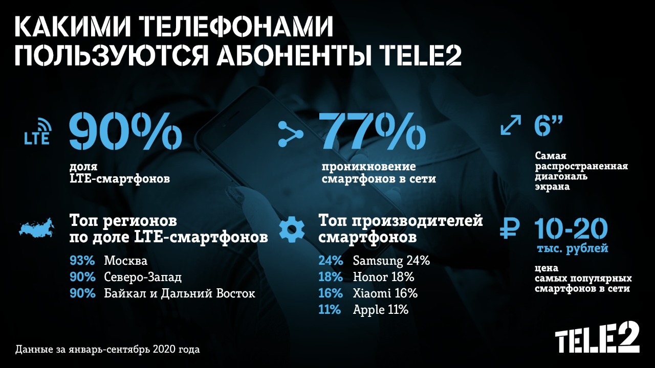 Tele2 проанализи- ровала предпочтения клиентов в выборе телефонов. В сентябре 2020 года проникновение смартфонов среди телефонов в сети оператора достигло 77%. При этом абоненты стали чаще выбирать модели с диагональю от 6 дюймов и стоимостью от 20 тысяч рублей.