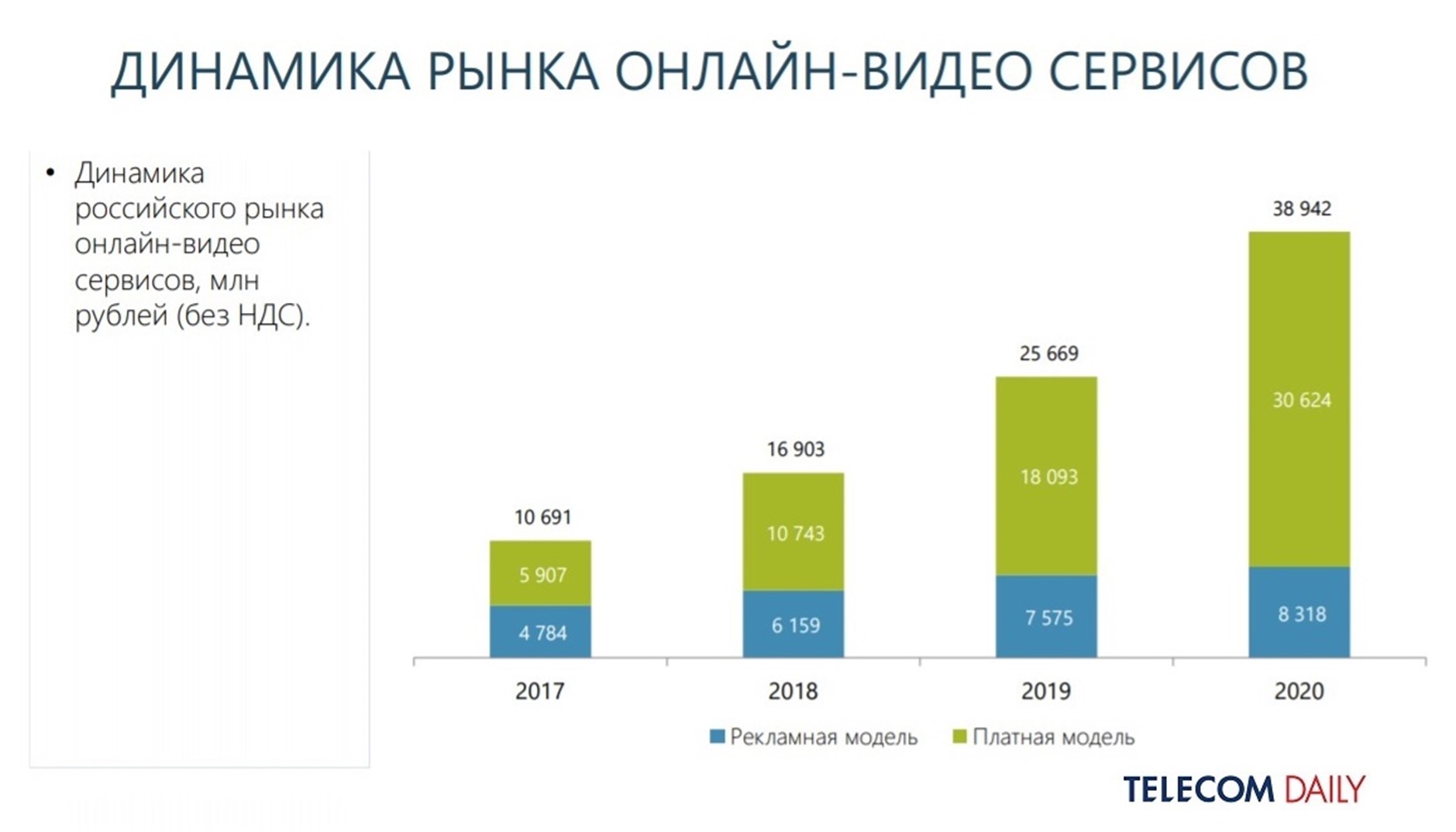 По итогам 2020 года общая выручка легальных онлайн-видеосервисов в России составила 38 млрд 942 млн руб., что на 52% больше чем годом ранее. Для сравнения, в 2019 рост по итогам года составил те же 52%.