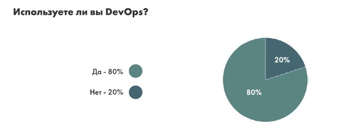 Подавляющее число респондентов (80%) использует DevOps. Около половины из них применяют эту методологию на большинстве своих проектов - от 50% до 70%. Остальные прибегают к DevOps на 20% проектах.