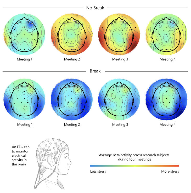 Microsoft опубликовала данные исследования, в рамках которого изучила электроэнцефалограммы (ЭЭГ) головного мозга людей, принимающих участие в видеосовещаниях. Результаты свидетельствуют о том, что большая часть цифровой перегрузки связана с отсутствием перерывов между совещаниями. Большое количество встреч подряд увеличивает стресс и затрудняет возможность сосредоточиться, однако даже небольшой промежуток времени между этими собраниями может помочь.
