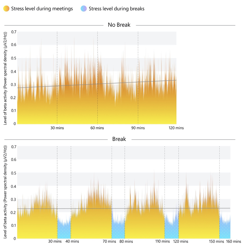 - Прыжки с одной встречи на другую могут вызвать стресс. Без перерывов бета-активность в мозге может резко возрастать в начале и конце встреч, что означает повышенный уровень стресса. Перерывы между разговорами помогают облегчить это напряжение.