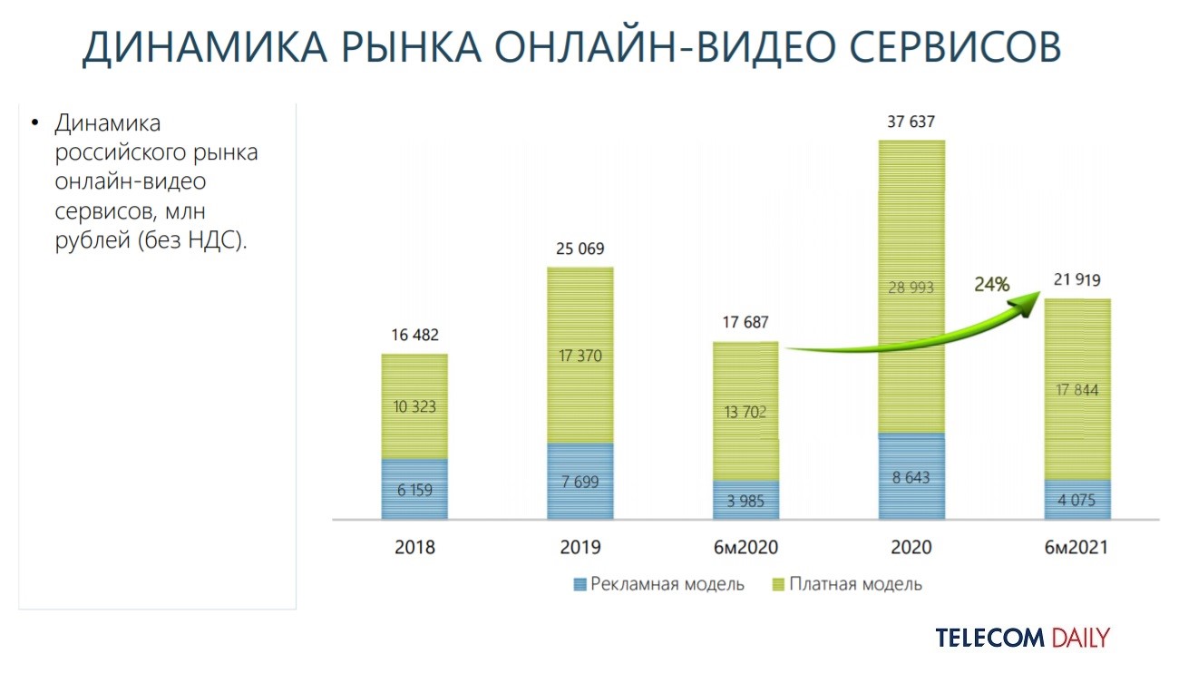 По итогам первого полугодия 2021-го общая выручка легальных онлайн-видеосервисов в России составила 21 млрд 919 млн руб., что на 24% выше, чем годом ранее. Однако ОТТ-сегмент не сумеет сохранить столь же высокие темпы роста, которые демонстрировал с 2018 по 2020 годы. По предварительным прогнозам TelecomDaily, выручка ОТТ-сервисов по итогам 2021-го вырастет на 25-30% — против 50% и более в предыдущие отчетные периоды.