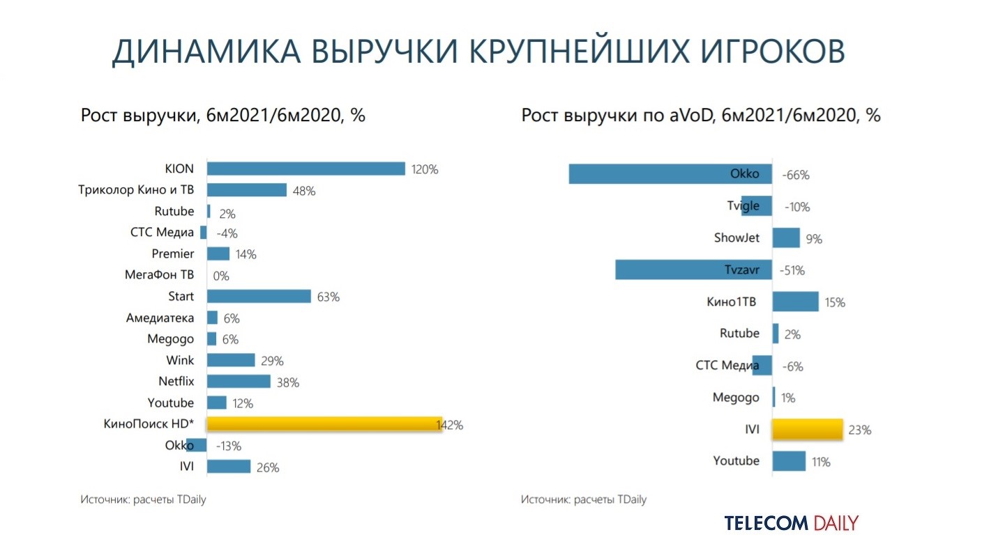 Так, ivi удалось отыграть наметившееся было снижение и за шесть месяцев вырасти с 23 до 24%. А вот вторым сервисом по объему выручки стал «Кинопоиск HD», который в предыдущем отчете делил с Netflix пятое место, — его выручка выросла с 8 до 14,1% (почти на 80%). В результате Okko отодвинулся на третье место и немного сократил долю — до 12,4% (против 15% по итогам 2020-го). Netflix тоже переместился вверх на одну строчку и занял четвертое место (8,9% против 8%). С третьего на пятое опустился YouTube, у которого доля снизилась до 7,9% (против 9%).