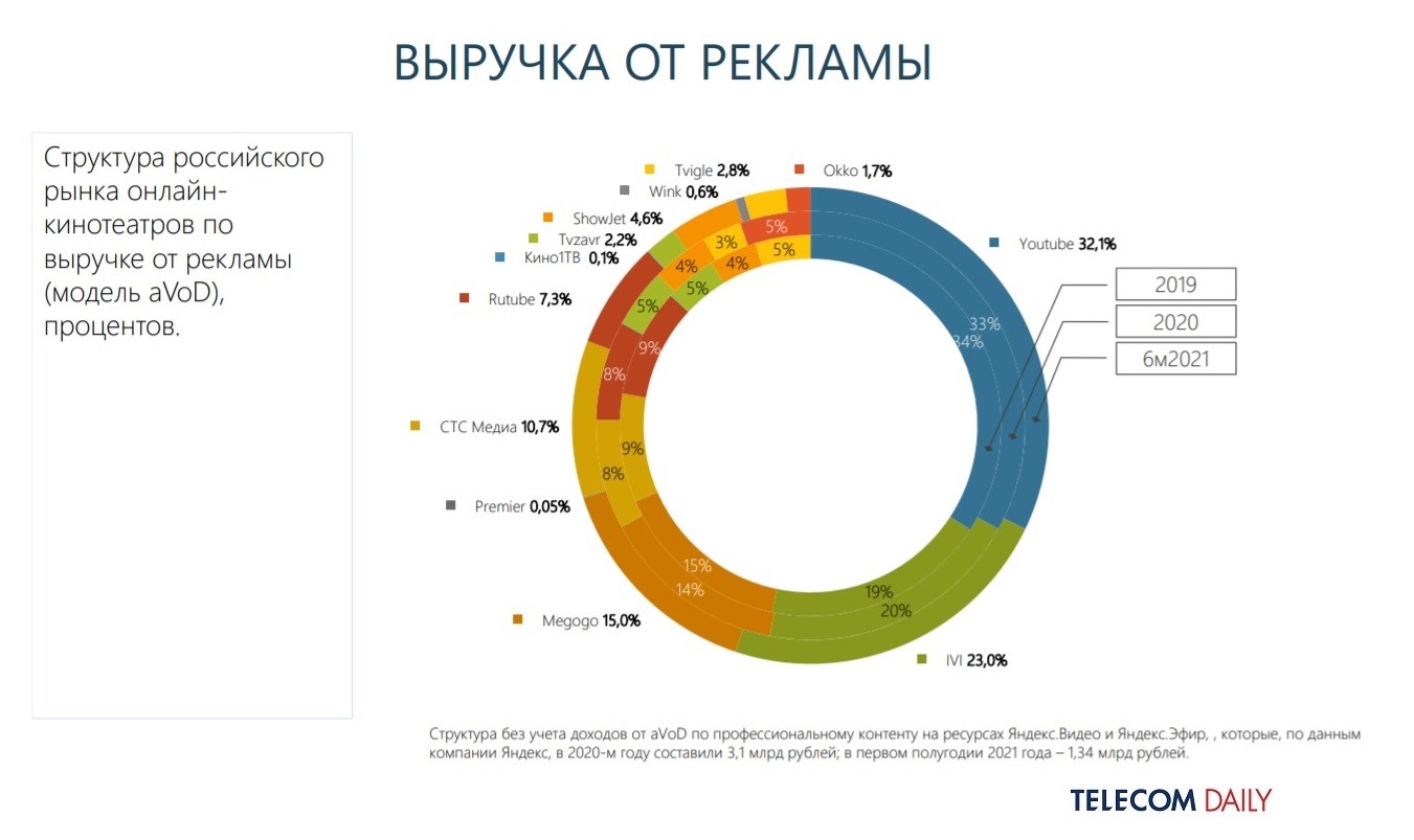 Показательно, что в доходах от рекламы доли распределяются совсем иначе. Здесь абсолютным лидером остается YouTube — 32,1% (против 33% по итогам 2020-го), наращивает выручку ivi — до 23% (против 20%) и оказывается в первой тройке Megogo — 15% (против 14%). В этом сегменте также заметны «СТС Медиа» — 10,7% (ранее — 8%) и RuTube — 7,3% (ранее — 8%).