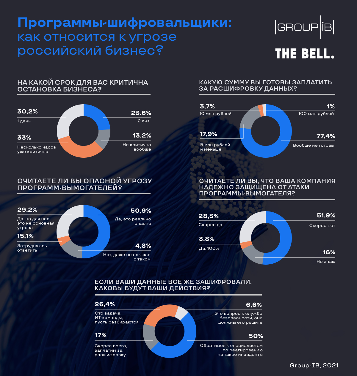 Group-IB выяснила, что 77,4% российских предпринимателей совершенно не готовы платить выкуп за расшифровку данных, при этом больше половины опрошенных — 51,9% — признают, что их компания «скорее не защищена» от атак программ-вымогателей.