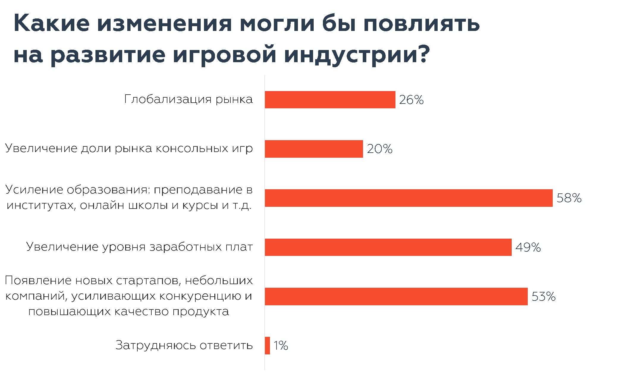 Помимо недовольства зарплатами, респонденты отмечали недостаток значимых бонусов: как финансовых, так и нефинансовых. Второй фактор, на который указывали эксперты – слишком узкий и закрытый рынок в России. Многие поясняли, что это связано с превалированием мобильных игр в стране, тогда как хочется работать над проектами для персональных компьютеров и консолей.
