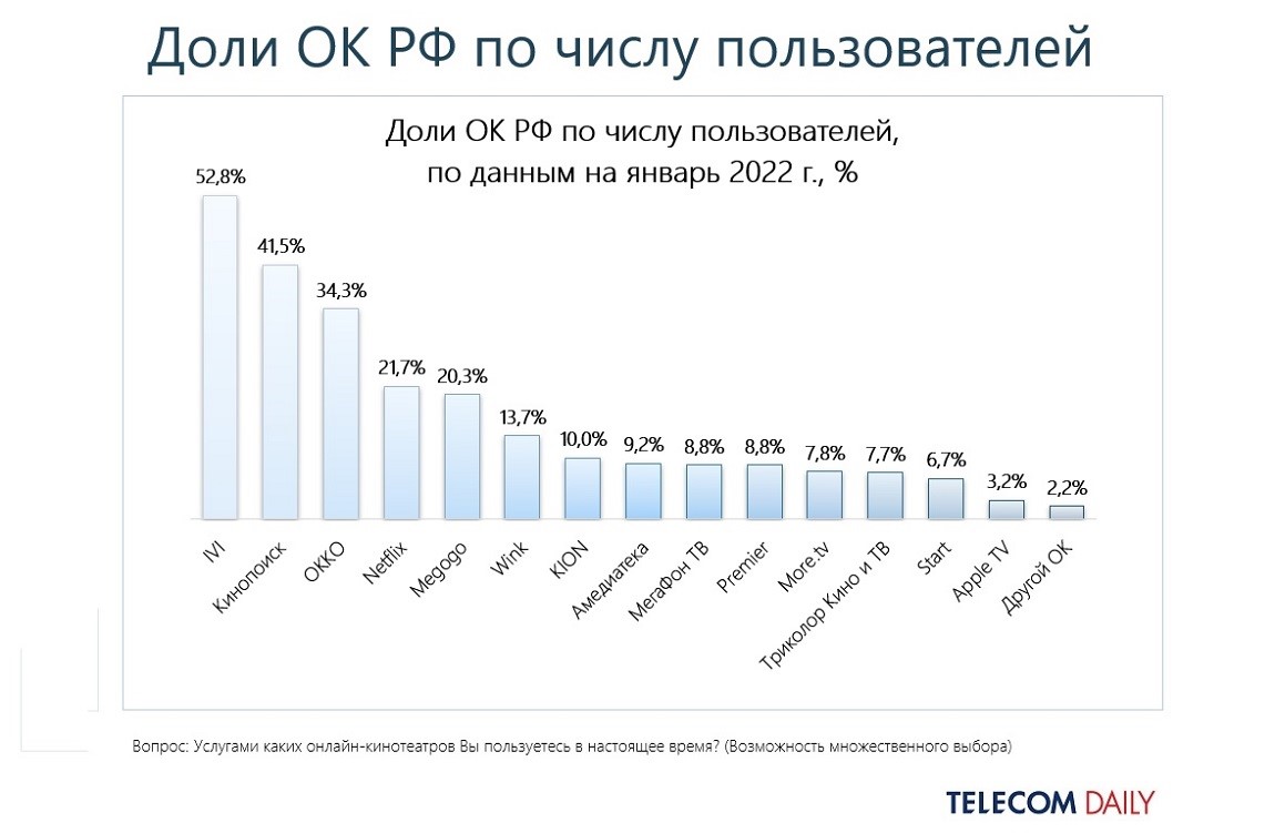 Среди кинотеатров с максимальной долей пользователей с платной подпиской все те же ivi (20,6%), «Кинопоиск» (17,3%), Okko (12,2%), Netflix (10,8%), но замыкает пятерку сервис Wink (7,4%), отодвинувший Megogo (6,8%) на шестое место. По сравнению с итогами первого квартала 2021-го свою долю сократили ivi, Megogo, Wink, а увеличили «Кинопоиск», Netflix и Okko.
