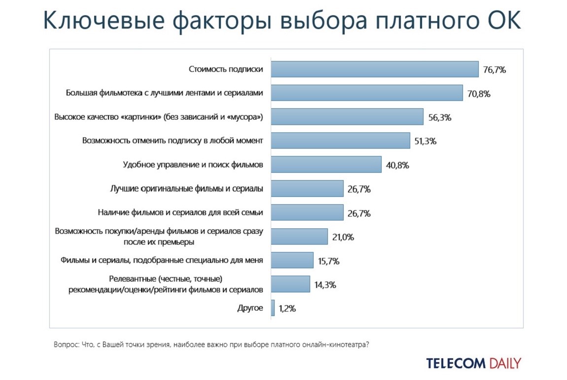 Из опроса следует, что ключевым фактором при выборе платного сервиса выступает стоимость подписки (так ответили 76,6%), чуть меньшее значение имеет размер фильмотеки (70,8%). Такие условия, как стабильность сервиса и возможность отменить подписку в любой момент, также идут почти вровень — 56,3% и 51,3%, соответственно. На удобном интерфейсе настаивают 40,8% респондентов. А вот за оригинальные фильмы и сериалы (которых нет на других площадках), готовы платить только 26,7% опрошенных.